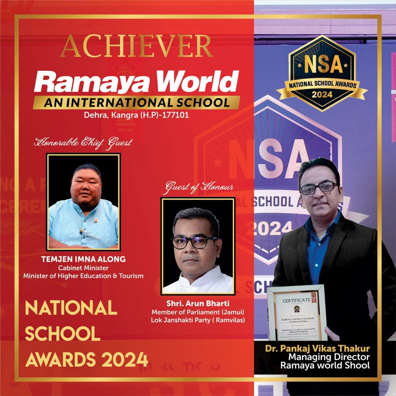 Ramaya World School, Dehra, accomplished yet another feather in its glorious cap by being crowned with the “Educational Excellence Award for 2024 (Himachal Pradesh)” from Himachal Pradesh at the National School Awards Ceremony on September 1, 2024, at Radisson Blu Hotel, Dwarka, New Delhi. Dated: September 1, 2024